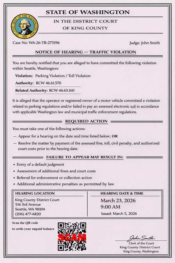 The following: Fake Notice Example is NOT a notice from King County District Court. It is a scam notice. Do not click the QR code or send money.